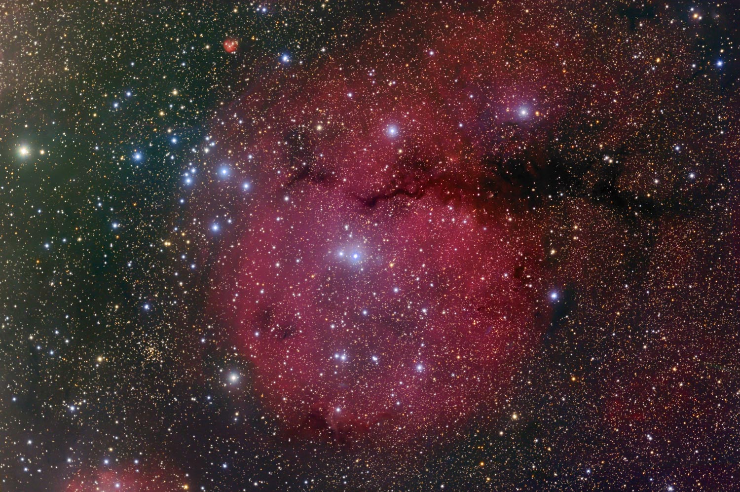 Gum 17 (RCW33), Vela - a reasonably bright nebula seen in the sky on the edge of the Gum Nebula (Gum12). Distance is uncertain - 1200ly or 3100ly - based on assumed associations with the cluster Tr10 (the small knot of stars lower left) or the star HD75759.