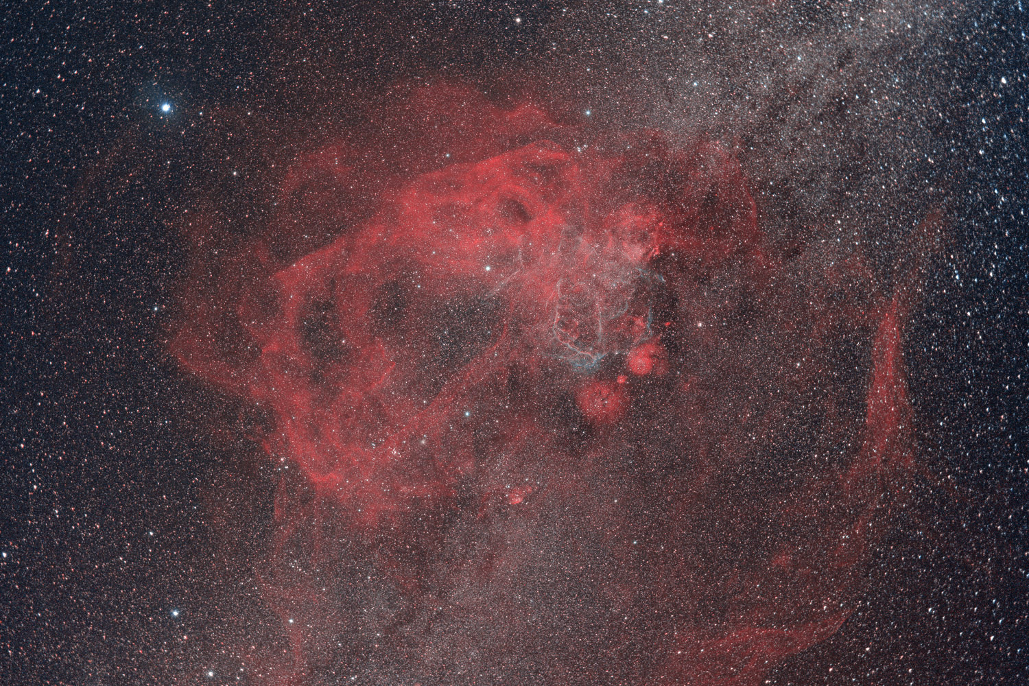 The Gum Nebula Complex and the Vela SNR, Vela/Puppis Named after Colin Gum, a late Australian astronomer, the Gum Nebula (Gum 12) is an emission region so large and close that it is actually very hard to see. Covering over 40° of the sky, it has a diameter of 1100 ly in with its front edge 450 ly from our solar system. It is believed to be a still expanding remnant (or remnants) of one, or more, supernovae that exploded millions of years ago. Also visible is the much younger supernova remnant, the Vela SNR, visible as the turquoise and red filaments (containing the degenerate core of the dead star, the Vela pulsar) to right of centre. Just below are two other objects from Gum's catalogue, Gum 17 and Gum 15. Canopus is the bright star upper left. ASV Crux Astrophotography Award winner 2014