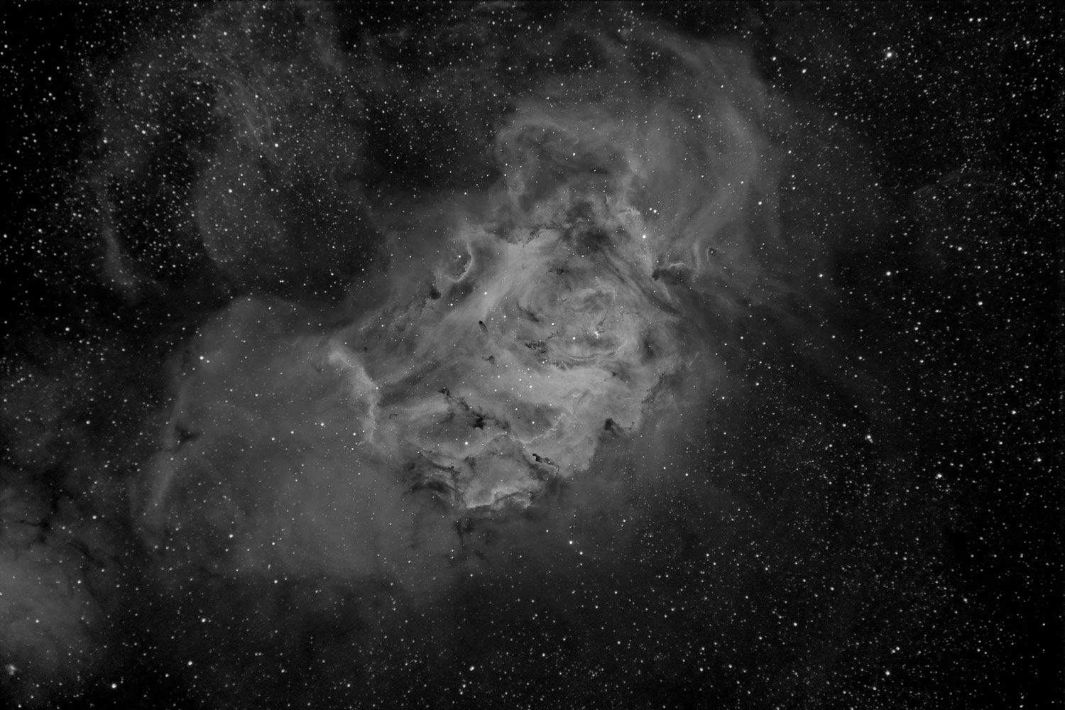 The Lagoon Nebula, M8, in the light of Hydrogen Alpha A deep look at the Lagoon Nebula in the light of Ha, taking advantage of the very high contrast that narrowband filter imaging provides. The dynamic range has been compressed substantially to bring out the faint outlying nebulosity, the detailed structures within the nebula and the numerous dark "Bok Globules", regions where stars are currently being formed. Distance 4100 ly.