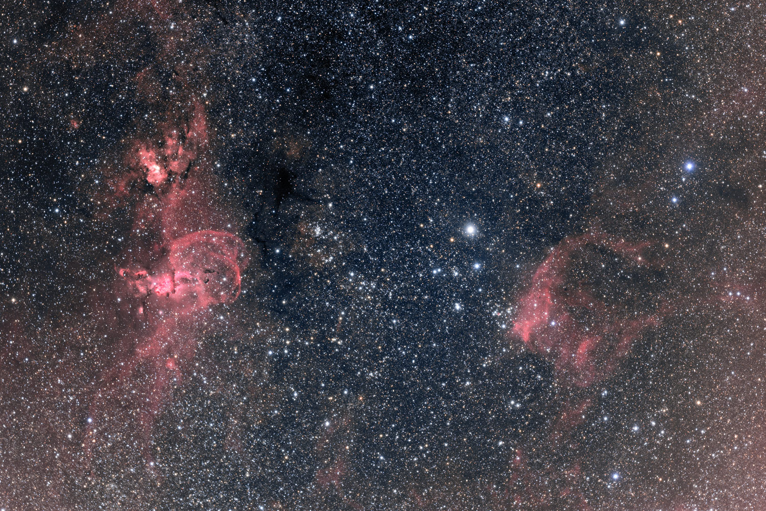 Three emission nebulae in Carina, NGC3603 and NGC3576, 79 Lying approx 3° east of the magnificent Eta Carina Nebula the three emission nebulae (NGC3603 top left, NGC3576 the looped structure lower left and NGC3679 to right) provide the focal point for what is a rather complex mix of stars, star clusters, extensive emission regions and dark dusty molecular clouds that obscure what lies behind. The nebulous arcs of NGC3576 (ca 7,000 ly distant) are suggestive of strong stellar winds from a massive young star, or star cluster hidden within, blowing shells of material back into space. NGC3603 is more than twice as far away as NGC3576 and contains an unusually rich collection of intrinsically extremely bright Wolf-Rayet stars (the white knot in the image) enveloped in nebulosity. That NGC3603 has a deeper reddish hue is indicative of its greater distance - its light has been significantly reddened by interstellar dust on its journey to us.