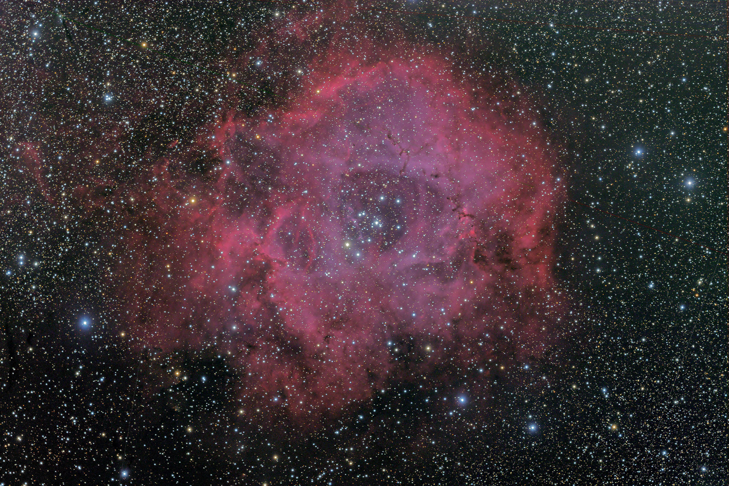 The Rosette Nebula, NGC2237-39, 46, Monoceros A wider view of this appropriately named nebula surrounding NGC2244, a young star cluster of ~15 stars including the yellow 6th magnitude star 12 Mon, that formed out of the nebula. Clearly evident is the cavity created by the stellar winds of the hot, young stars. Visible, too, are numerous dark dusty regions and globules suggestive that star formation is on-going. With an estimated mass of 10,000 solar masses the nebula has plenty of material left for star formation in the future; distance 2,600 ly. Here's a closer view.