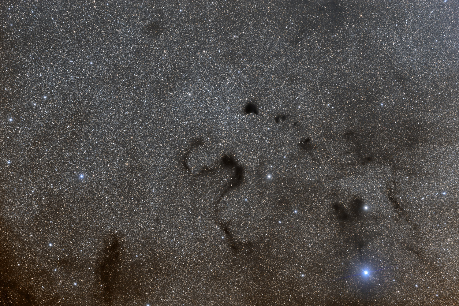 Barnard 72 - The Snake Nebula Located in Ophiuchus in a field strewn with countless distant stars the Snake Nebula (number 72 in E. E. Barnard's catalogue of dark nebulae) provides a dramatic centre-point in this photograph. The Snake and the the other dark nebulae in the field are regions of dense dust and gas that prevent the light of distant stars from getting through. Other Barnard objects in the field are B68, the dense crescent-shaped nebula above right of the Snake whilst, running clockwise, are B69 and B70. They are just a few of the numerous dust and gas clouds found in Ophiuchus/Sagittarius and along the entire Galactic plane of our Galaxy. The bright blue star bottom right is q Ophiuchi; the field spans about 20ly at the distance to B72 of 650ly.