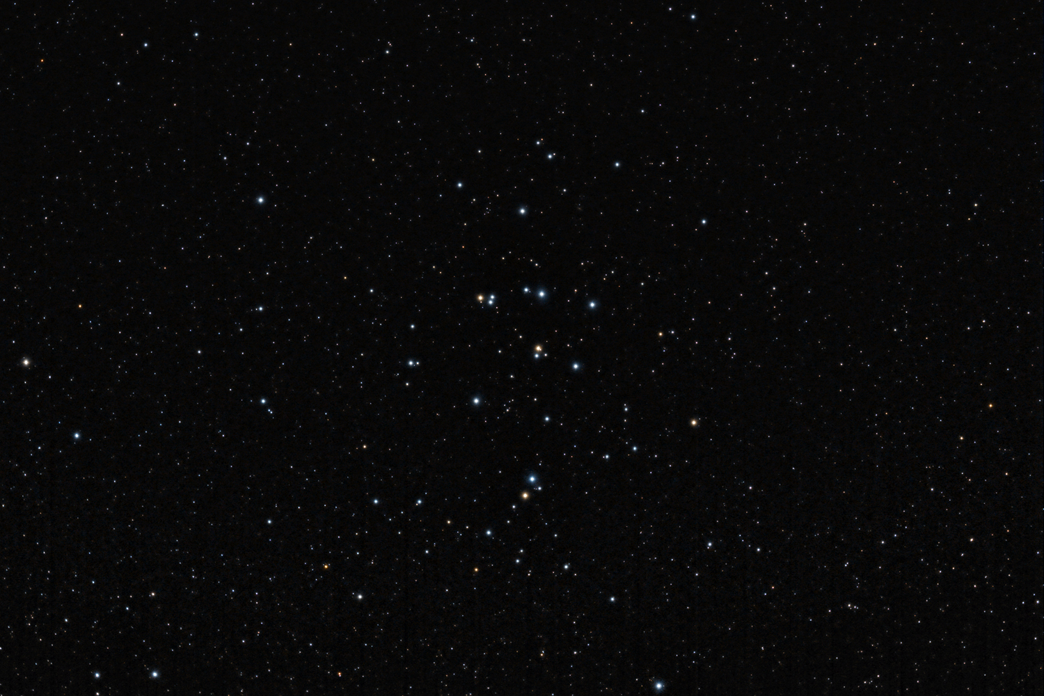 The Praesepe, M44, Cancer At ~600 ly away, it is one of the nearest open clusters to Earth and is visible to the naked eye as a small milky patch of light under dark skies. It was also known as "The Beehive" to the ancients and is estimated to contain about 1000 stars, including stars in the later stages of evolution, such as three red giants (visible in the image) and a number of white dwarfs. Best estimates of age suggest a figure of about 600 My, which places significant constraints on the masses of the progenitor stars which have fully evolved to become white dwarfs. |