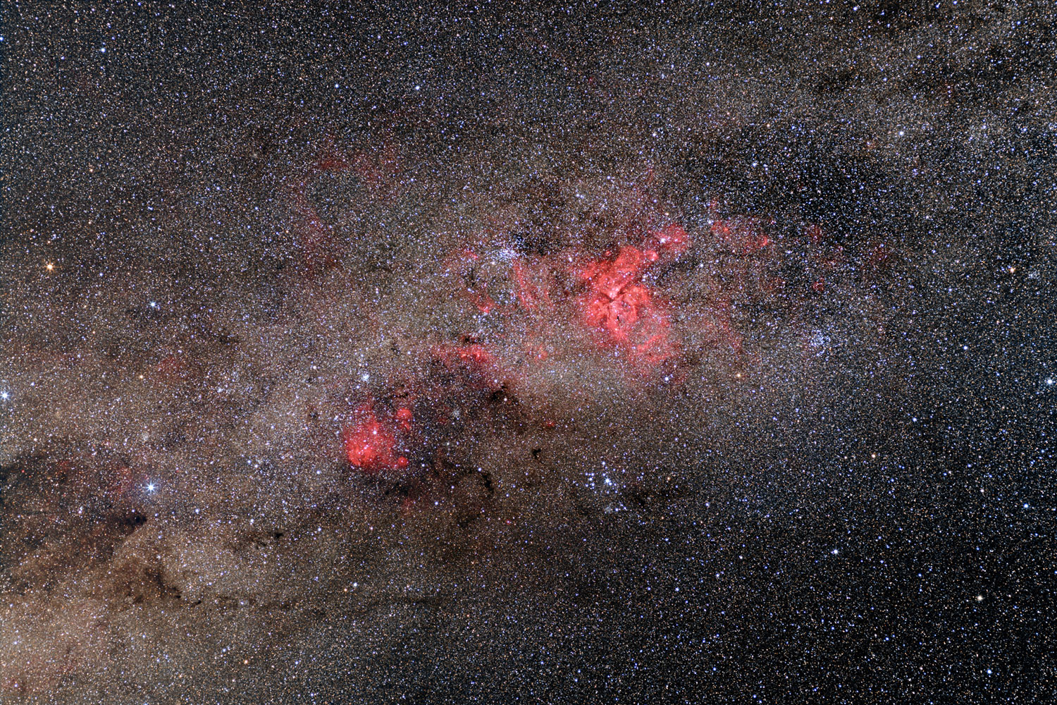 The Carina Region - a remarkable field containing dozens of deep sky objects - emission nebulae, including the Eta Carina Nebula, the Running Chicken Nebula (and many others), star clusters, star fields and dark nebulae. The Southern Cross and The Coal Sack are on the left. David Malin Astrophotography Award winner 2012.