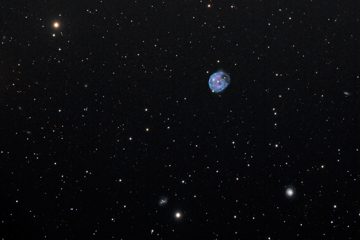The Skull Nebula, NGC 246 Located in Cetus, NGC 246 is a medium-sized planetary nebula (4' x 3.5') having the well-deserved moniker, "The Skull Nebula"- two dark lobes for eyes and a curve of blue emission nebulosity for the mouth. The outline of the nebula is predominantly blue OIII emission with some Ha and Hb emission inside. No doubt there are fainter extensions to the roughly spherical nebula and one is faintly visible at 12 o'clock. Overall of mag 8.5 it has a central white dwarf star of 12th mag, easily visible in the image. The distance to NGC 246 is uncertain, estimated 1600-2500 ly. The field contains many galaxies, in particular NGC255, a lovely face-on barred spiral to the lower right (70Mly away), two others, at 3 o'clock and 7 o'clock and many fainter ones on the left of the image.