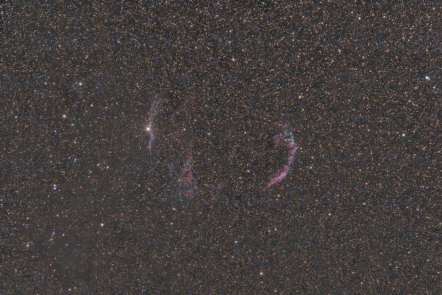 The Veil Nebula, Cygnus The remnants of an estimated 20-solar mass star that suffered catastrophic core collapse in a brilliant supernova explosion 10,000 to 20,000 years ago. It was likely brighter than Venus, visible during the day and the shell(s) of wreckage have continued to expand into space at 1.5 million km/hr ever since to achieve its currently measured diameter of 130 ly. This expansion was confirmed photographically by the Hubble Space Telescope when images taken in 1997 and 2015 were compared. It is a relatively difficult object to image well from the latitudes of southern Australia as it never rises much more than 20o above the northern horizon. Nevertheless, the essential details of the nebula are present in the image - the Eastern Veil (left). Western Veil (right) and Pickering's Triangle - defined in the colours of hydrogen (red) and oxygen (blue-green). Astrometrically determined distance is 2,400 ly.