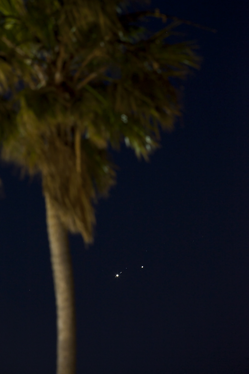 three moons of Jupiter - from l to r: Io, Europa, Ganymede and Callisto are lined up