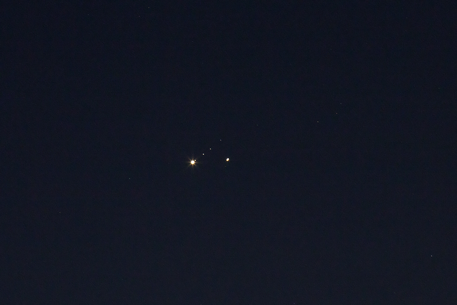 four moons of Jupiter - from l to r: Europa, Io, Ganymede and Callisto line up. Saturn's moon, Titan is at 6:30 o'clock to the planet