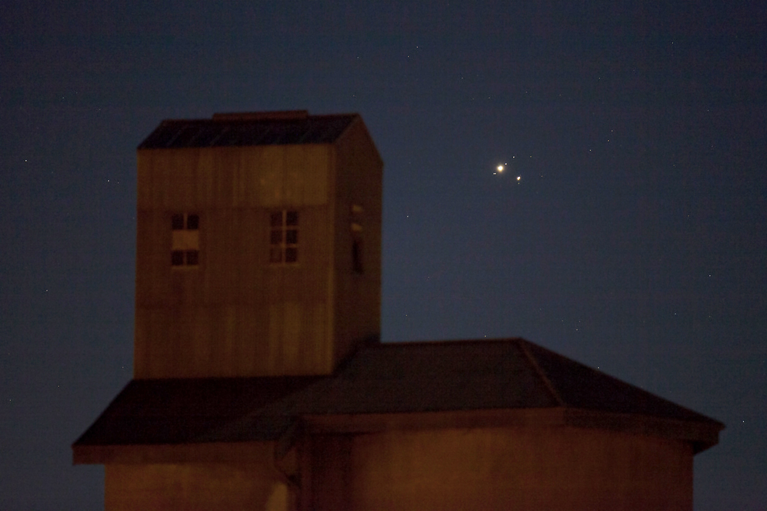 three moons of Jupiter - from l to r: Europa, Ganymede and Callisto line up. Saturn's moon, Titan is at 6 o'clock to the planet. Plenty of field stars, including one just to the right of Europa