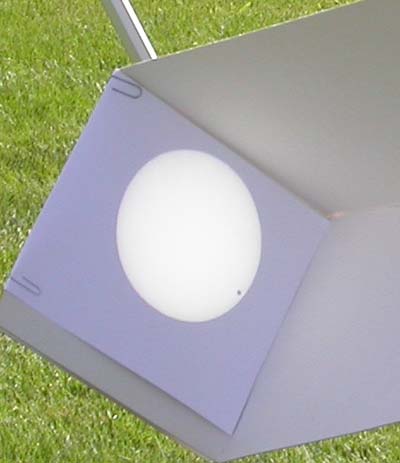 Taken at 8:39am just after second contact using a lens combination of effective focal length 1400mm and f/22 with an OD 5.0 solar filter fitted to the front; 1/60s exposure onto 400ASA film. |