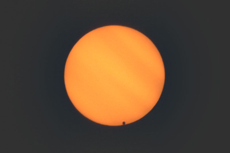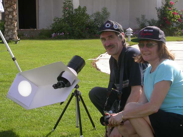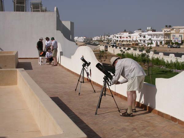 June 8th Well...it finally happened! After an almost 122 year wait Venus eventually passed across the face of the Sun on the 8th June 2004 in what must be one of the most eagerly awaited astronomical events of all time. The western hemisphere was particularly favoured with all locations in the UK positioned to see the complete transit. As was the case with the total solar eclipse in 1999 and the Leonid meteor storm in 1999 I did not want the Scottish weather to dictate visibility of this incredibly rare event, so I (along with a few other members of AFA) travelled to Sharm el Sheikh, Egypt, where cloud-free skies were guaranteed. And so it transpired...and I perspired under the baking Egyptian sun! It was truly fascinating to see the black circular dot of Venus slowly move onto, and then across, the sun's photosphere in an event lasting almost 6 hours. From Egypt the transit started around 8:21am and finished around 2:20pm. Temperature in the shade was mid to high 30's C. |