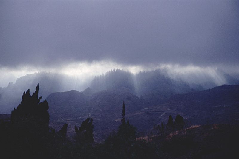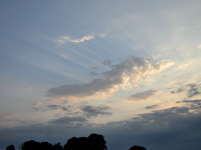 Unusual crepuscular rays seen on Tenerife formed by sunlight filtering through gaps in cloud and a forest of trees. |