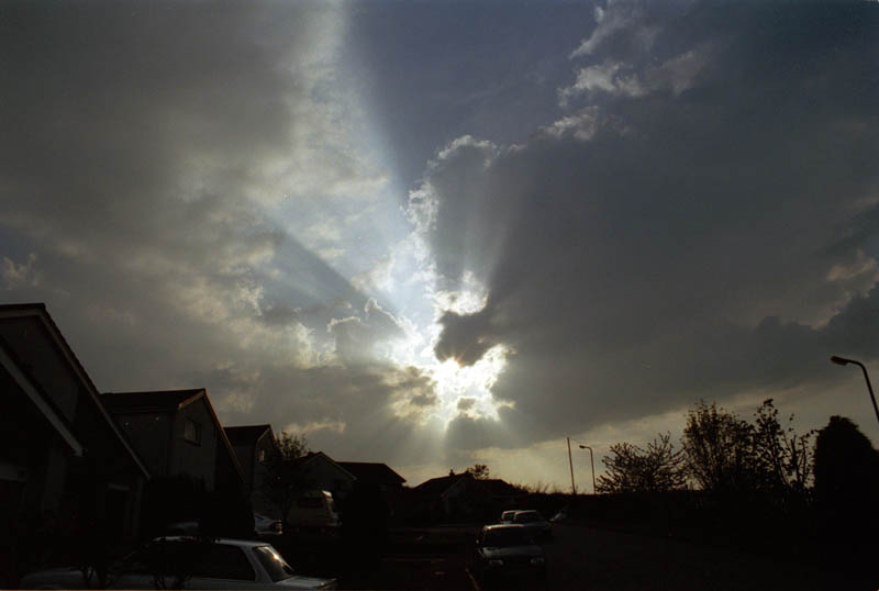 Crepuscular rays. Beams created by sunlight filtering through gaps in the clouds. |