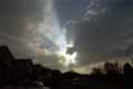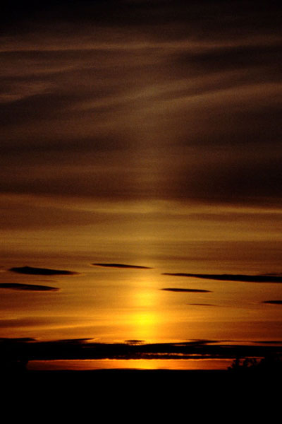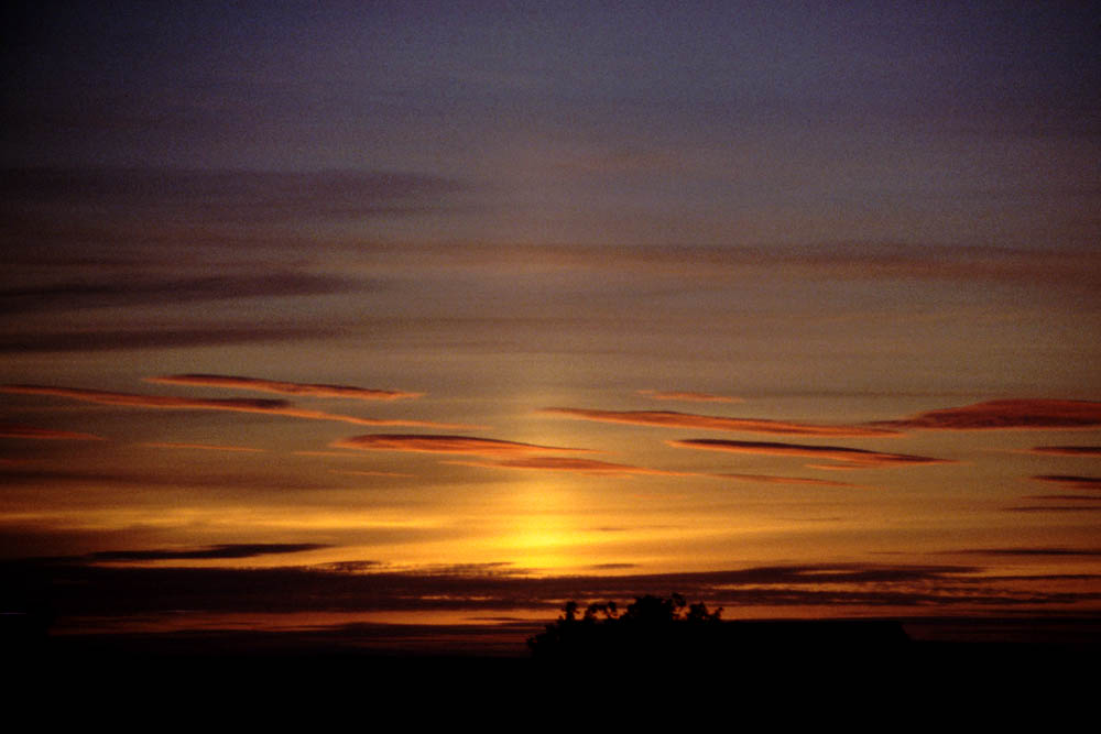 Solar pillar. Light of the setting sun reflected by ice crystals in clouds. Here is a close-up view. |