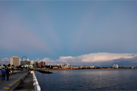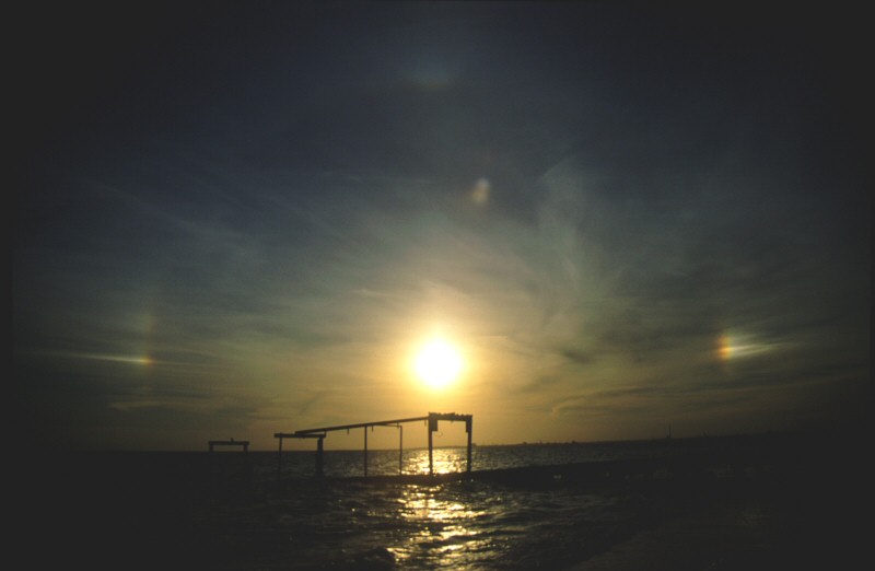 | A wonderful display of sundogs and a trace of an upper tangent arc imaged over Elwood beach, Melbourne, April 2005. | |
