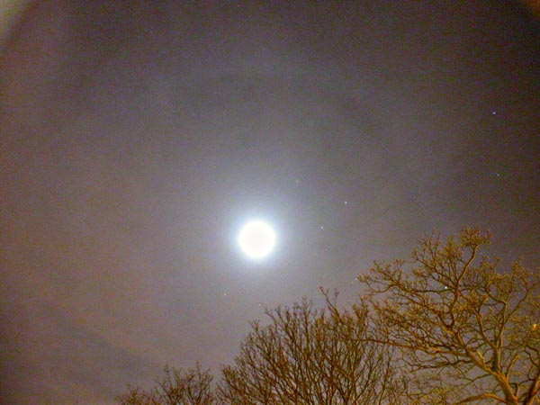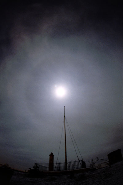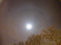 Lunar halo. Produced in similar fashion to the solar halo, but generally much weaker due to the lower brightness of the moon. |