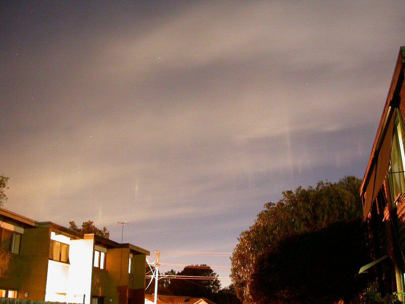 | Observed over Melbourne on the evening of the 18th March 2006. An auroral display? Not likely... as the view is looking NORTH over the CBD about 35km away. Most likely, a phenomenon (similar to solar/lunar pillars) created by bright lights below the local horizon reflecting off ordered ice crystals in the clouds above. | |