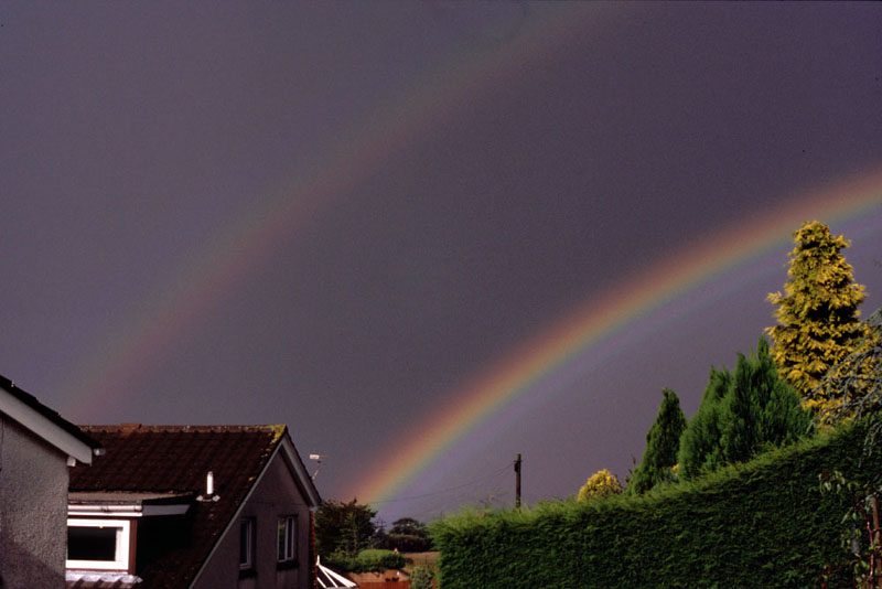 A close-up of a double bow showing the reversal of the colour sequence in the secondary bow and the region of dark sky between the bows. |