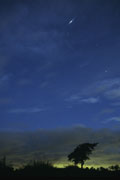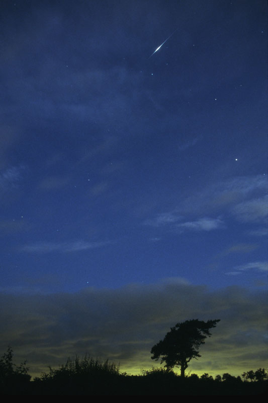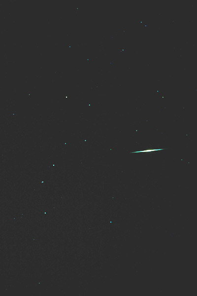 An accidental iridium flare image! I was photographing the Aquila region and  skywatching when I caught a bright glint out of the corner of my eye. When the film was developed I was delighted to find what I thought to be a fireball, but the trail was just too symmetrical to be a meteor! 5 min exposure onto Kodachrome 200 slide film through a 28mm lens at f/1.8.